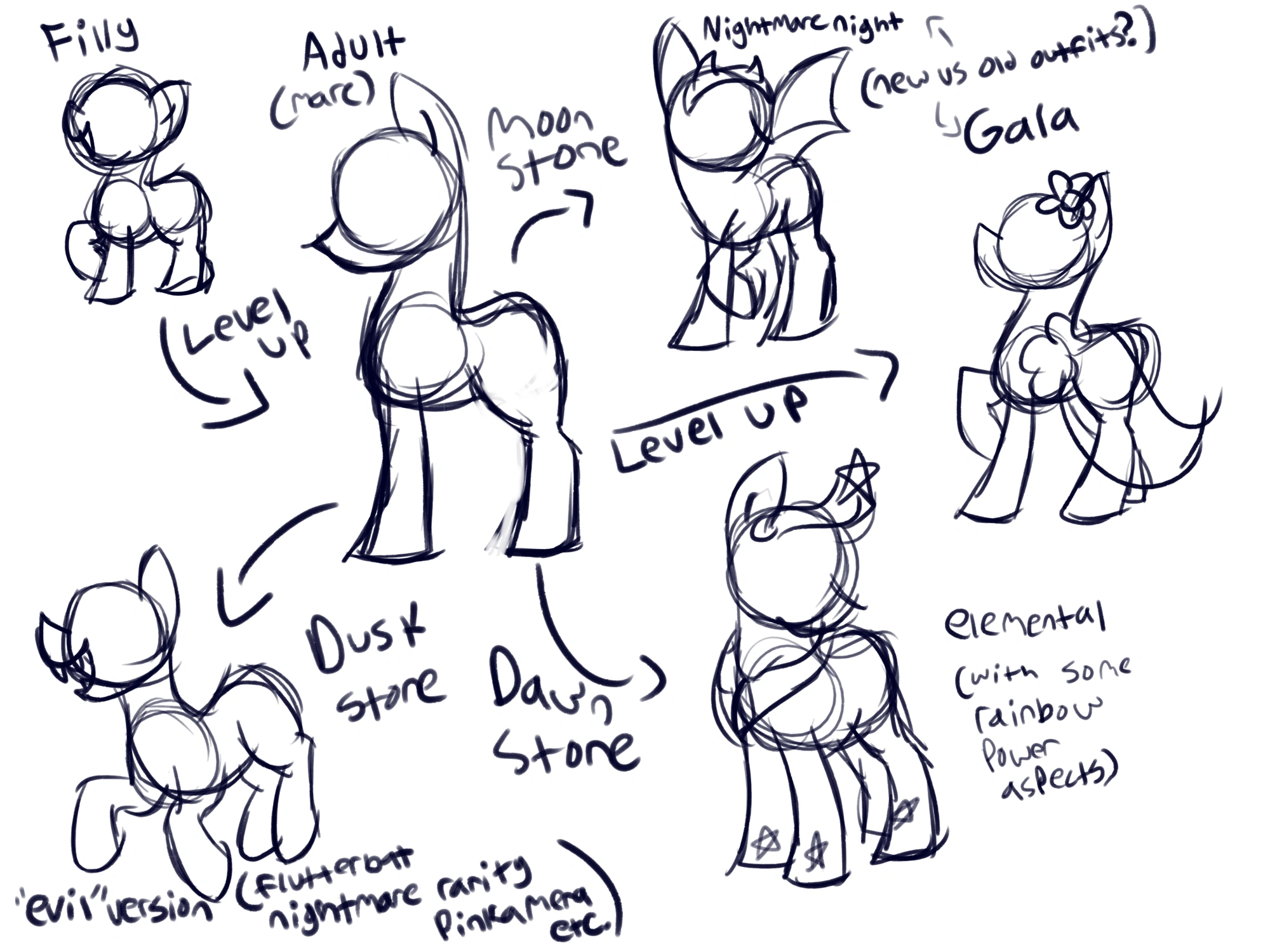 I'd like to share some of my ideas for the game, I have a lot that have been brewing for a long time in the back of my mind. First off if I'm in control of this again, I'm going to start from scratch once again. I want to make this more that just "pokemon but with ponies" so things like changing the map and npcs would be something I'd like to do. With this, I think I'll be making the game shorter if I was to make a new narrative/map or edit the old one. I also have many thoughts about ponies and their evolutions, as well as which ponies are going to be in the game. The mane 6 starters, as well as two versions, will still be at the beginning. Here's a little work in progress diagram I sketched up of the forms the mane 6 can evolve into.